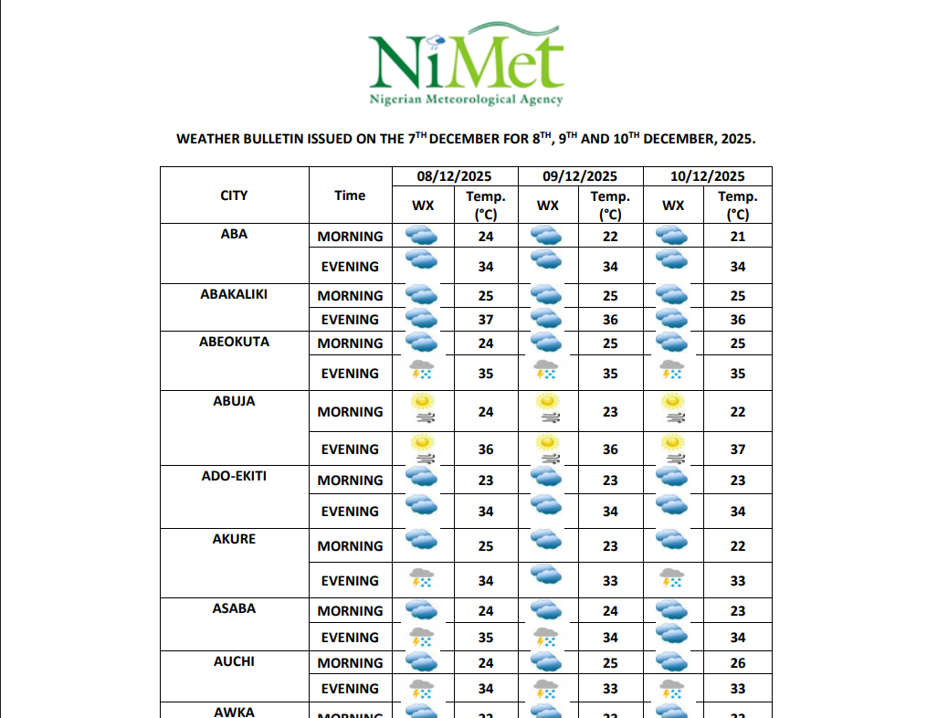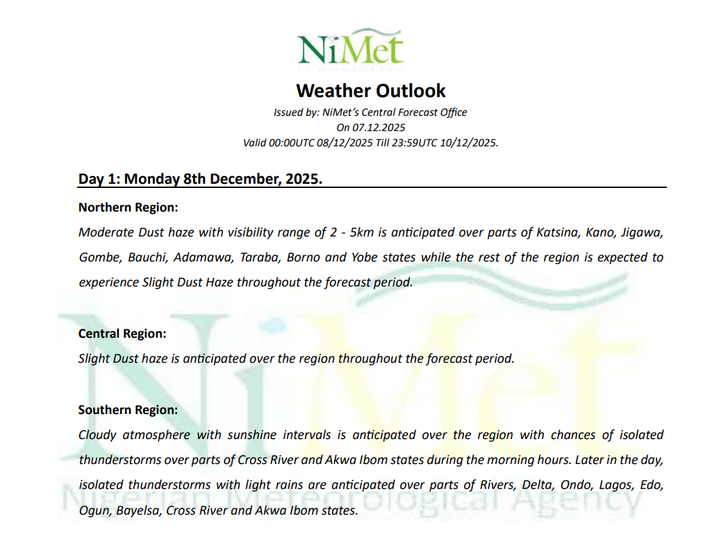 Weather Outlook Issued by: NiMet’s Central Forecast Office on 28.11.2025. Valid from 00:00 UTC 29/11/2025 till 23:59 UTC 01/12/2025.